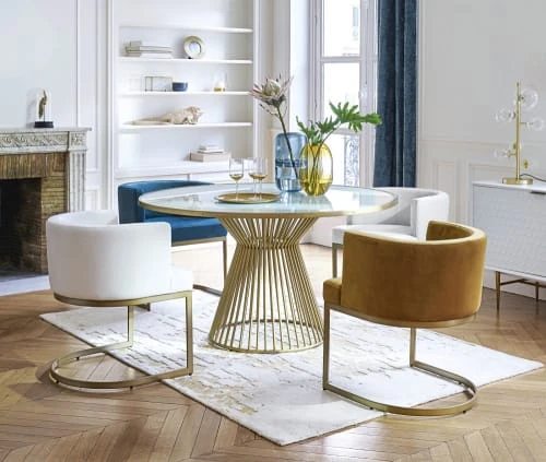 Non, vous ne rĂŞvez pas : le fauteuil en velours bleu canard REQUIEM s’est mis sur son 31 ! Avec son style vintage, il s’invitera dans un salon rĂ©tro ou dans un salon contemporain façon Gatsby Le Magnifique. Difficile de ne pas rĂ©sister devant son piĂ©tement original tout en mĂ©tal, son revĂŞtement 100% velours et sa teinte bleu canard. Tendance, vous dites ? Ce fauteuil est un must-have pour votre salon ! Le conseil de notre styliste : grâce Ă son confort et son bon maintien, il fera parfaitement l’affaire autour d’une table Ă manger en mĂ©tal noir ou en bois massif.
